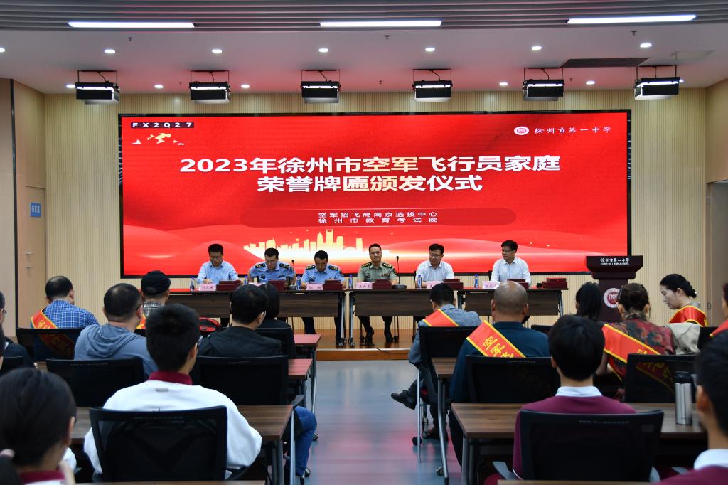 9月25日,2023年(nián)徐州市空軍飛行員家庭榮譽(yù)牌匾頒發儀式(shì)在我校舉行。空軍招飛局(jú)南京(jīng)選拔(bá)中心上校徐翔,徐州一(yī)中副校(xiào)長孟彥,市教育考試院院長郭(guō)鳳清等出席活(huó)動。徐州一中有誌於從軍報國的高三學生,受表彰(zhāng)飛行員家長(zhǎng)和所在高中校領導、老師共同參加。市教育考試院劉(liú)元(yuán)慶主持儀式。