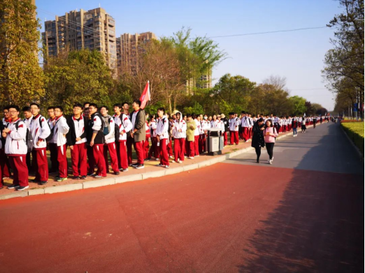 誓師(shī)大會結束後,同學們按班級有序從校園(yuán)南門出發,沿漢源大道一路南行,目的地徐州消防(fáng)支隊,單程約7.5公裏。全員徒(tú)步行進,隊伍整齊(qí)、口號響亮、精神飽滿。沿途寬廣嶄新的紅(hóng)磚林蔭道、生機盎然的綠樹紅花、高大雄偉的建築樓群(qún)令同學們心曠神怡。同學們(men)互幫互助,齊(qí)心協力,不叫(jiào)苦,不喊累,一(yī)路(lù)歡聲笑語,一路青春飛揚。
