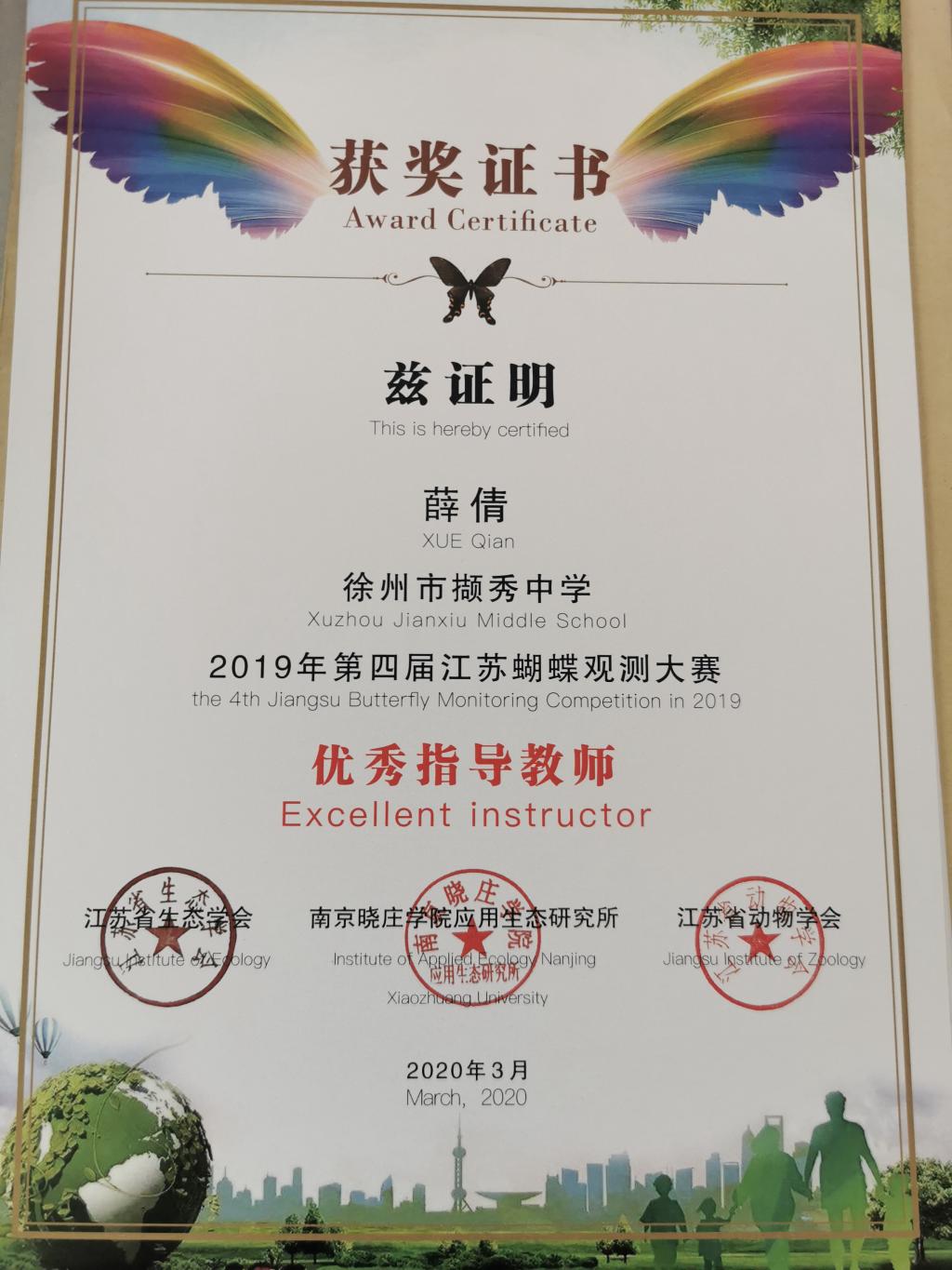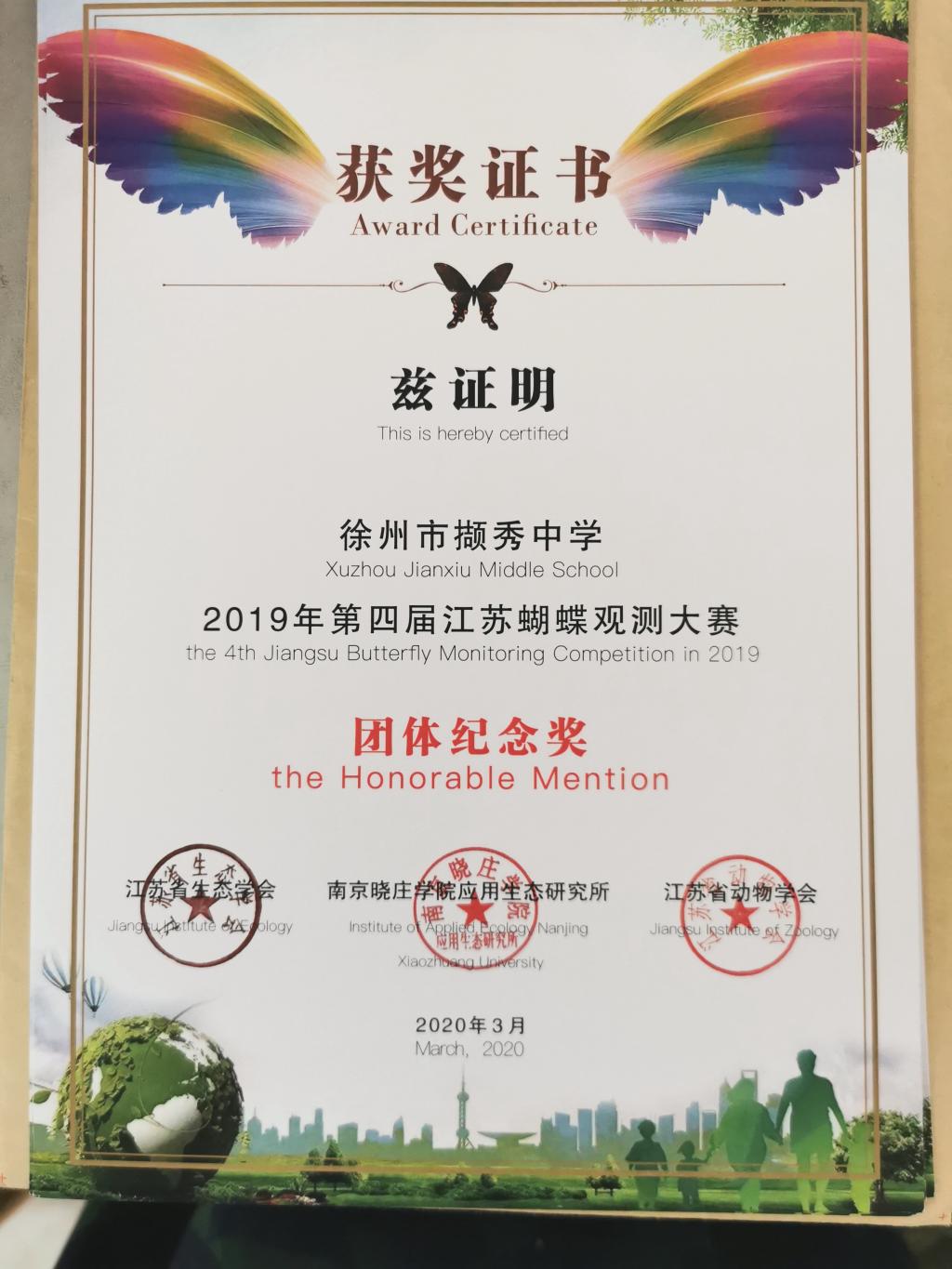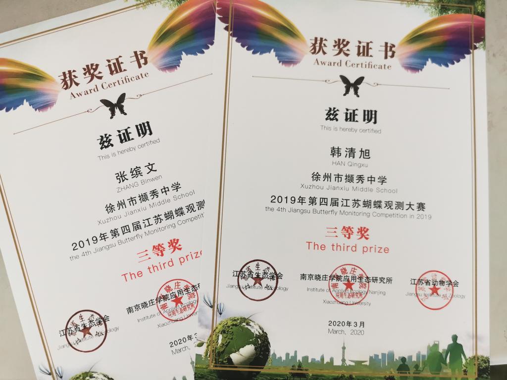 我校(xiào)生物學科組教師組織同學走出校門,走進大(dà)自然,進(jìn)行了“江蘇蝴蝶(dié)觀測大賽”活動,活動成果得到江蘇蝴蝶監測中心的肯定。詹昕荻等17位同學(xué)獲得個(gè)人獎項,郭軍英、袁維娜等4位教師獲得優秀指導教師獎,徐州一中獲得2019年第四屆江蘇蝴蝶(dié)觀測大賽團體(tǐ)二等獎,同時獲得2017—2019年江蘇蝴蝶觀測大賽優秀站點獎。