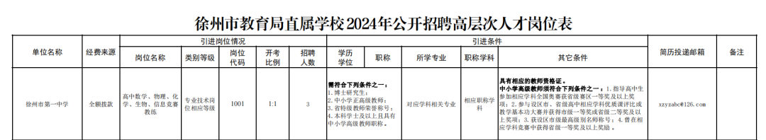 徐州市第一中學2024年(nián)招聘高層次人才公告