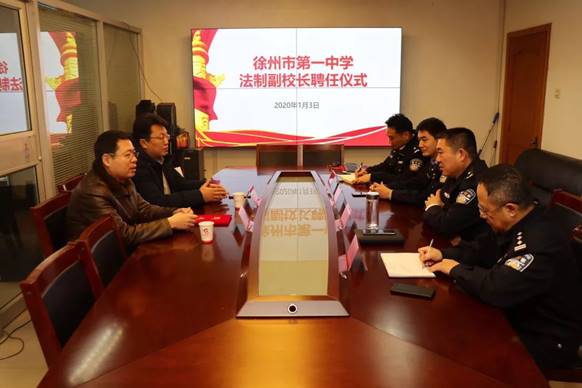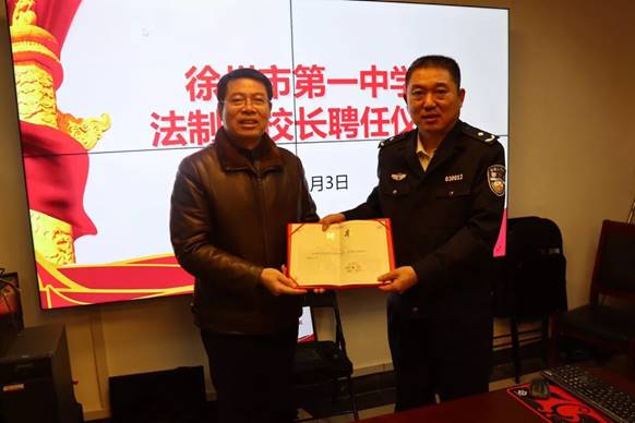 1月3日上午,徐州一中法製副校長聘(pìn)任儀式在市公(gōng)安局舉行。魏全(quán)星副校長代表徐州一中(zhōng)向市公安局孫益龍副局(jú)長頒發了法製副校長聘書。