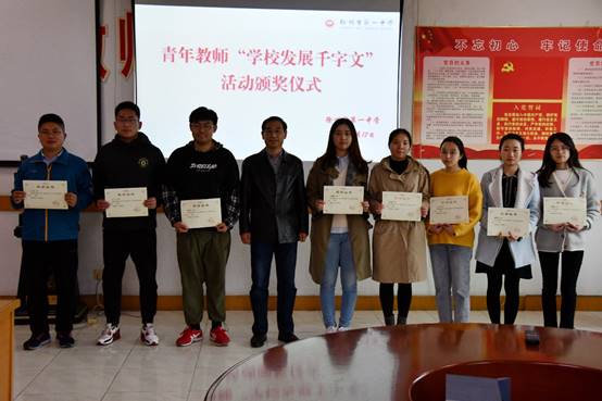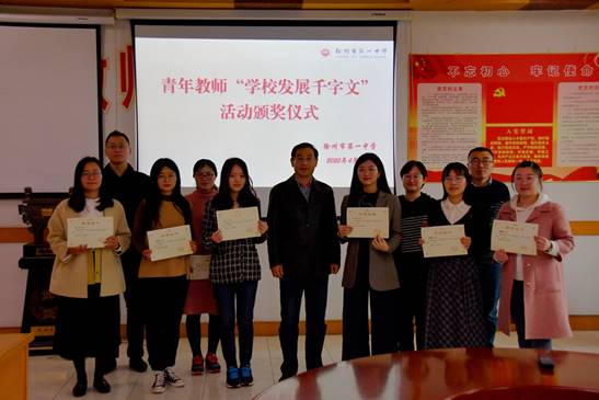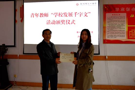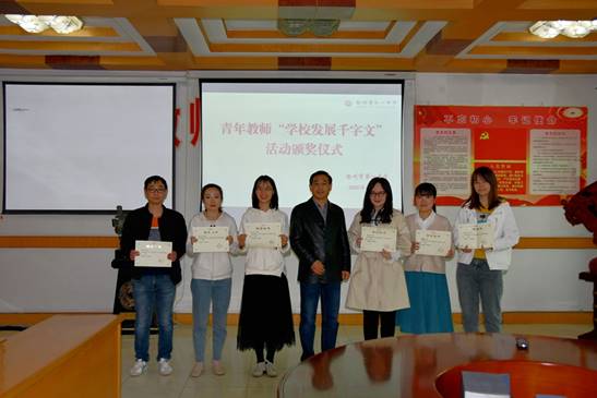 頒獎儀式開(kāi)始前,梁繼程(chéng)宣讀了《關於(yú)“學校發展千字文(wén)”優秀征文表彰的決定》,通告了“學校發展千字文(wén)”活動的舉辦目的、評選過程(chéng)和評比結果(guǒ)。張安義代表學校黨委和校長室向獲(huò)獎青年頒發了榮(róng)譽證書,並勉勵青年教師潛心教育,主動做事、用心(xīn)做事、真(zhēn)心做事,爭取在最短時間內成長(zhǎng)為一名教學功底紮實和(hé)專業素養水平高的優秀骨幹(gàn)教師。