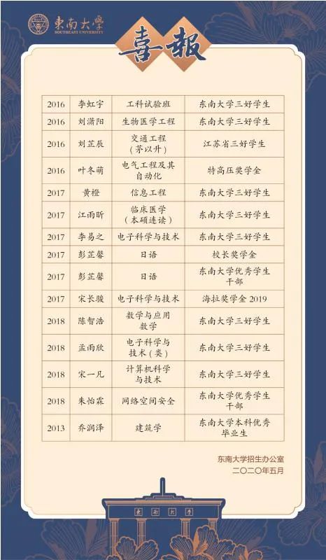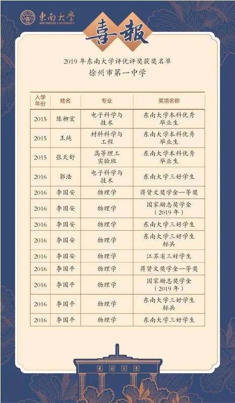 自建校以來,徐州一中為東南大學輸送了一(yī)批(pī)又一批優(yōu)秀(xiù)學子,他們在東南大學取(qǔ)得優異的(de)成績(jì),為學校贏得(dé)了多(duō)種榮譽!在2019年東南大學評優(yōu)評獎中(zhōng),徐州一中學子表現優異(yì),獲(huò)得(dé)多種表彰和獎勵。
