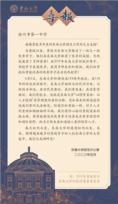 近日,東南大學向我校(xiào)發來喜(xǐ)報,感謝徐州一中作為東南大學優質生源基地,多年來對東(dōng)南大學招生工作的大力支(zhī)持!
