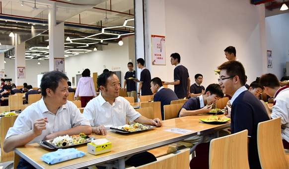 “今天(tiān)做的飯菜可口嗎?”“平時一餐的價格大概多少(shǎo)?”“食堂的飯菜能吃飽嗎?”察看後廚之後,徐市長來到餐廳,仔細詢問(wèn)學生們對餐品(pǐn)的滿意度,“我今天的吃的兩葷一素套餐,一共8元”,“飯菜很(hěn)實在(zài),男生(shēng)一份餐足夠了”,聽到(dào)學生的回答,徐(xú)市長連連稱好(hǎo),並與陳青校長(zhǎng)一同陪學生用餐。