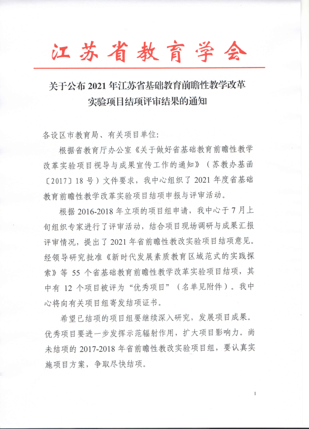 江蘇省教育學會近期發布文件《【2018前瞻(zhān)結(jié)項】關於公布2021年省(shěng)前瞻性項目結項評審結果的通知》,我(wǒ)校省前瞻項(xiàng)目《普通高中數字化實驗室支撐理科深度學習的教學改革實踐建構》結項並獲得優秀,在省高中組中排名第一(yī)。
