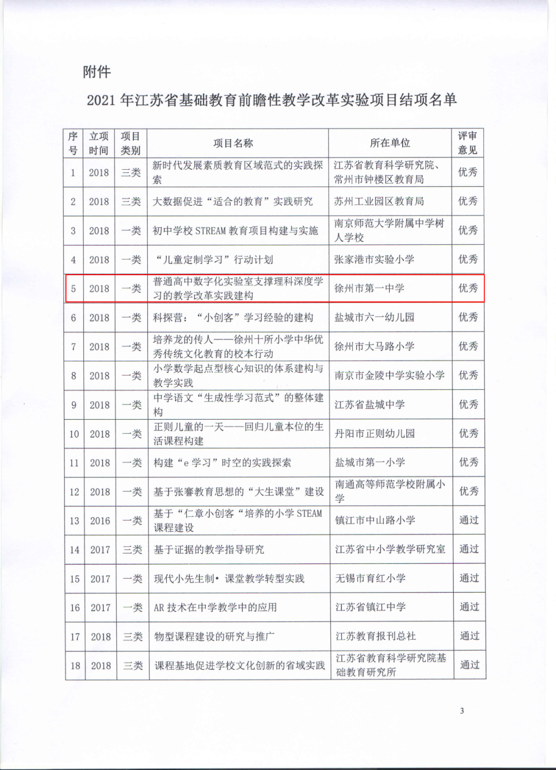 江(jiāng)蘇省教育(yù)學會近期發布文件《【2018前(qián)瞻結項】關於公布2021年省前瞻性項目結項評審結果的通知》,我校省前(qián)瞻項目《普通高中數字化實驗室支撐理科深度(dù)學習的(de)教學改革實踐(jiàn)建構》結項並(bìng)獲(huò)得優秀,在(zài)省高中組中排名第一。