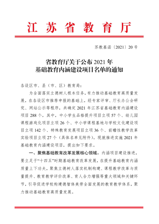 近日,江蘇省教育廳辦公室下發《省教育廳關於(yú)公布2021年基(jī)礎教育內涵建設項目名單的通(tōng)知》(蘇教(jiāo)基(jī)函〔2021〕20號)文件,我校《健康體適能課程基(jī)地》成功(gōng)入選2021年江蘇省普通高中課程基地建設(shè)項目。