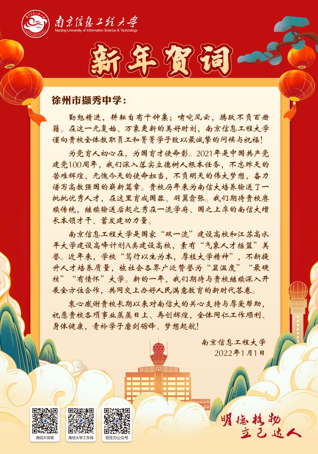 南京信息(xī)工程(chéng)大學向我(wǒ)校發來新年賀信