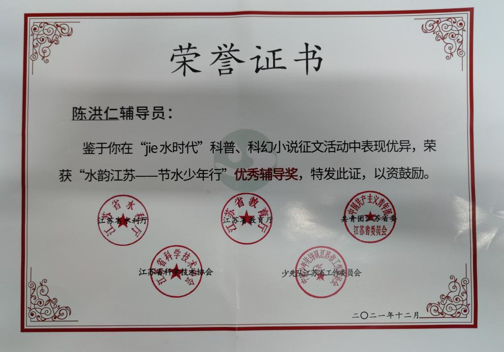 日前,在由江蘇省水利廳,江(jiāng)蘇省(shěng)教育廳(tīng),共青團江蘇省(shěng)委等聯合舉辦的水韻江蘇科普科幻小說征文大賽中,我校高一(yī)(5)班學(xué)生張珂凡創作的科幻小說《劫水時代》,以(yǐ)獨特(tè)的視(shì)角,超前的意識,跌宕(dàng)起(qǐ)伏的故事(shì)情(qíng)節,在眾多的作品中(zhōng)脫穎而出,勇奪大(dà)賽一等獎(jiǎng),陳洪仁老師榮獲優秀輔導獎。特此祝賀!