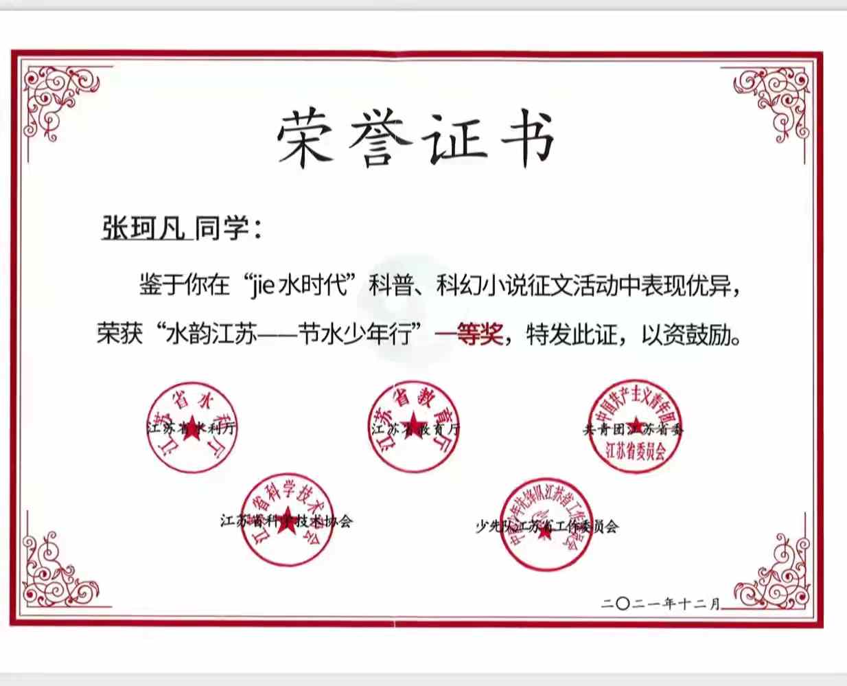 祝賀張珂(kē)凡(fán)在江(jiāng)蘇省(shěng)科普科幻小說征文(wén)大賽中榮獲一等獎!