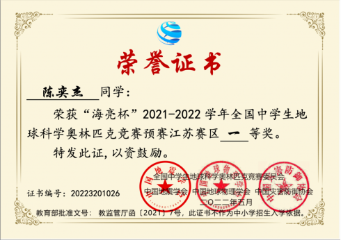 近日,全國中學生地球科學奧林匹(pǐ)克競(jìng)賽預賽結果公布,我校高一年級陳奕傑在地理學科組胡佳晶老師(shī)的指導下,榮(róng)獲江(jiāng)蘇賽區一等獎(jiǎng)!