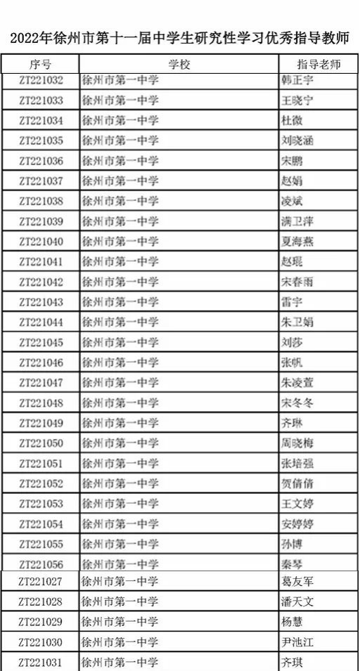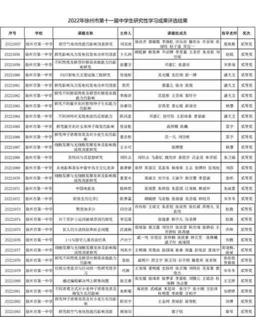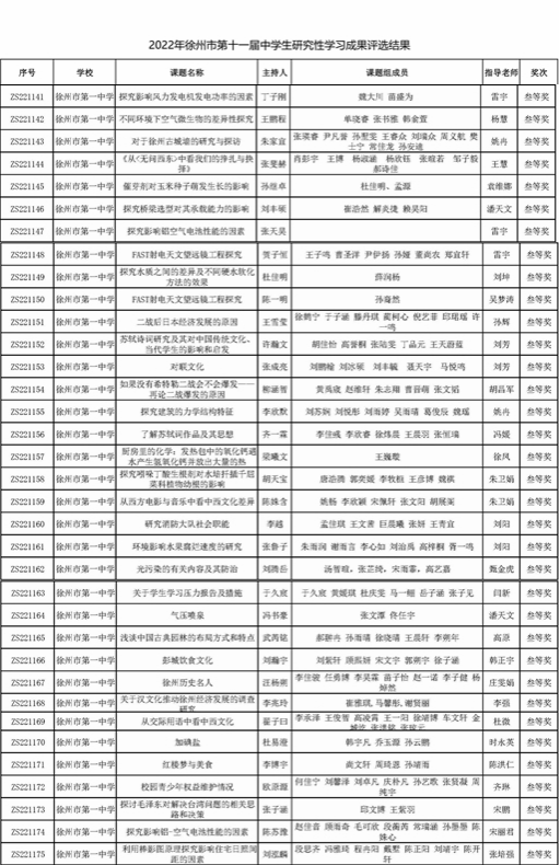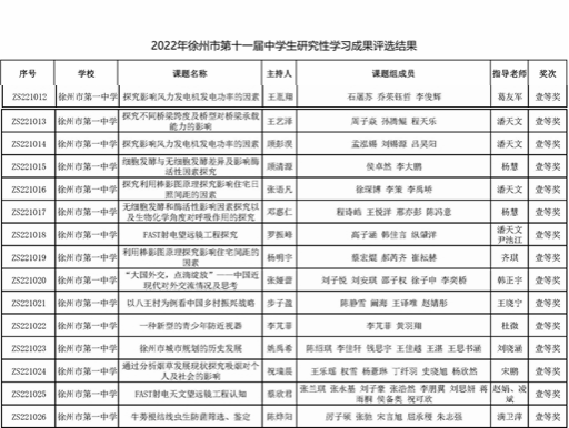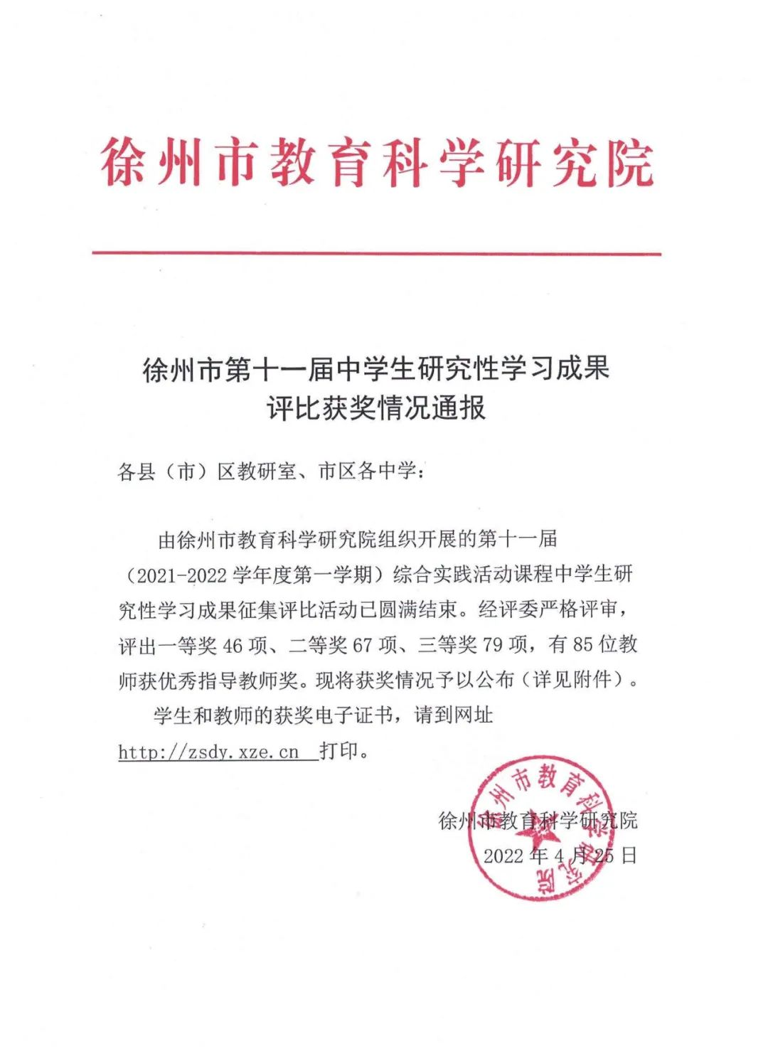 近日,市第十一屆中學生(shēng)研究性學習成果評比(bǐ)結果公布,徐州一中(zhōng)共有77名學生獲獎,其中一等獎15名,二等獎27名,三等獎35名;31名教師獲優秀指導教師獎(jiǎng)。