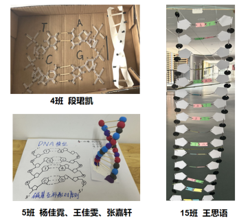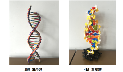 同(tóng)學們一呼百應,比賽進行的如火如荼。在上交的一百多份作品中,2班張丹好、4班董明赫、6班張津銘(míng)、7班劉嘉繹(yì)、16班王(wáng)瀚晨的作品設計具有特色(sè)且精美,在比(bǐ)賽中獲得一等獎(jiǎng)。二(èr)等獎中,4班段珺凱同學利用廢舊筆芯做成(chéng)堿基對的化學式和分子模型,創意新穎。15班王思語利用廢舊卡紙做成DNA平麵分(fèn)子長鏈,十分震撼。部分精彩作品(pǐn)展示如下: