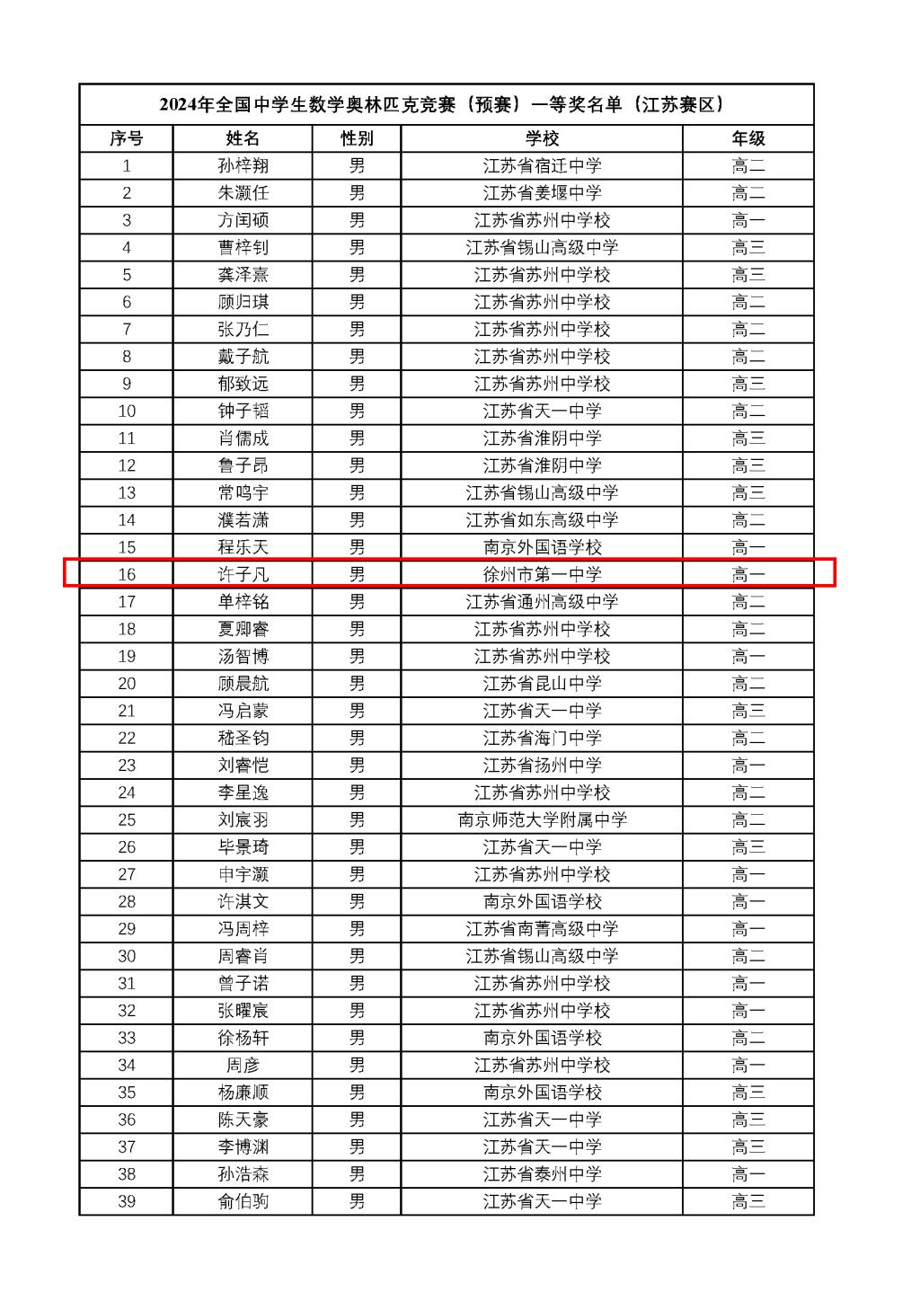 日前,中國數學會公布了(le)2024全國中學生數學奧林匹(pǐ)克(預賽)江蘇賽區一等獎和省隊名單,徐(xú)州一中3人獲賽區一等獎(jiǎng)(國一),許子凡同學以低年級身份入選省隊。