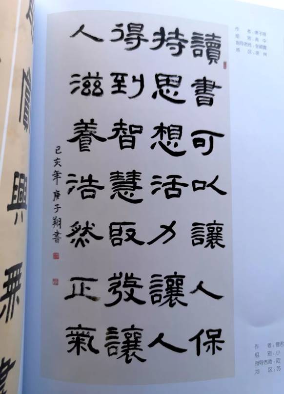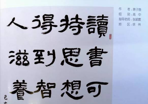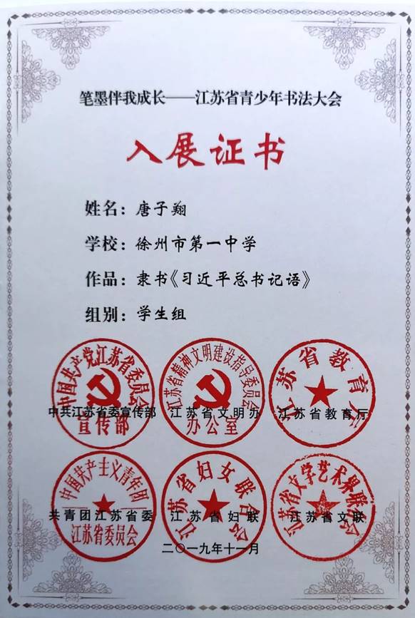日前,由中共(gòng)江(jiāng)蘇省委宣(xuān)傳部、江(jiāng)蘇省文明辦、江(jiāng)蘇省教育廳、共青團(tuán)江蘇省(shěng)委、江蘇省婦聯、江(jiāng)蘇省文聯共同主辦的“筆墨伴我(wǒ)成長”江蘇省青少年書法大會,共征集到來自江蘇全省各地的作品25000餘幅,經初評、複評、終評,最終(zhōng)選定170幅學生(shēng)入展作品,我校高(gāo)二(8)班唐子翔同學(xué)的書法作品《習近平總書記語》名列其中。