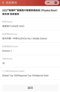 徐州(zhōu)一(yī)中國際部(bù)學子在2022年美國“物理碗”競賽中摘金奪銀!